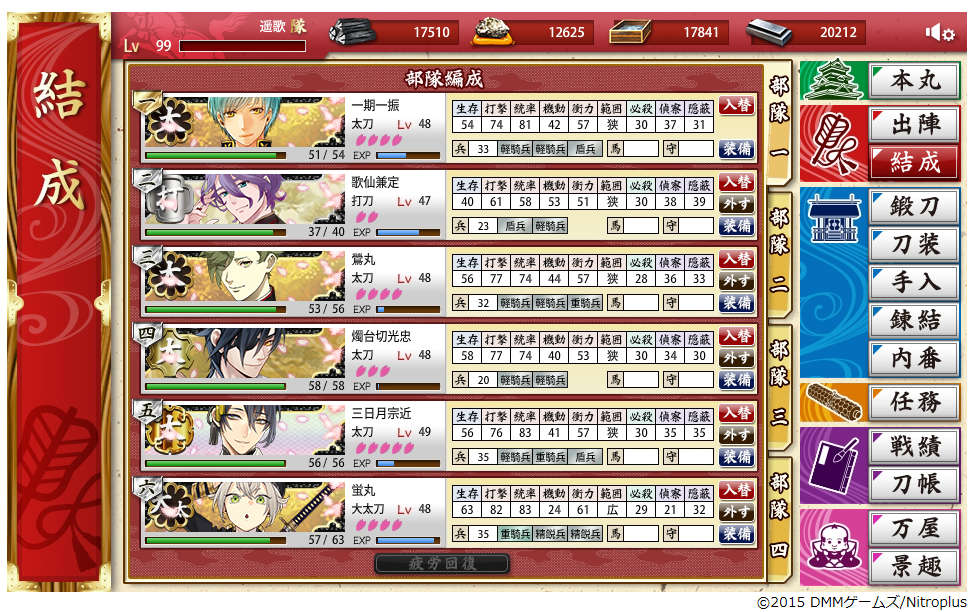 日課こなしで、こねえええと3-3やら5-3,5-4やらも徘徊しつつ、ふとみれば4-1メンツが一にぃ以外桜付き(三日月隊長だった)